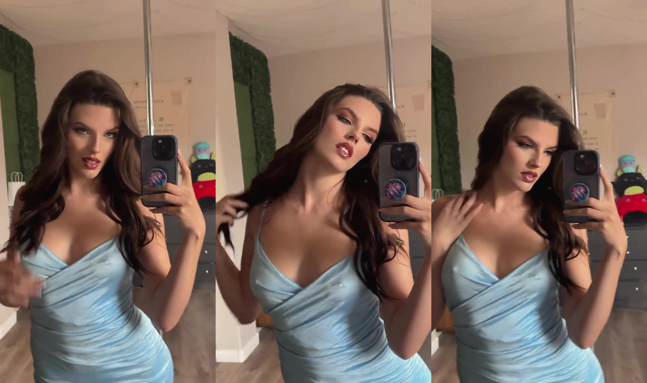 In this steamy clip, a gorgeous woman in a light blue dress teases with a mirror selfie. She playfully touches her hair and lips, hinting at what's to come. Imagine her slowly slipping off that dress, revealing her curves, and inviting you in for a night of passion. Get ready to watch her seduce and tease, leading to hot, intense sex.