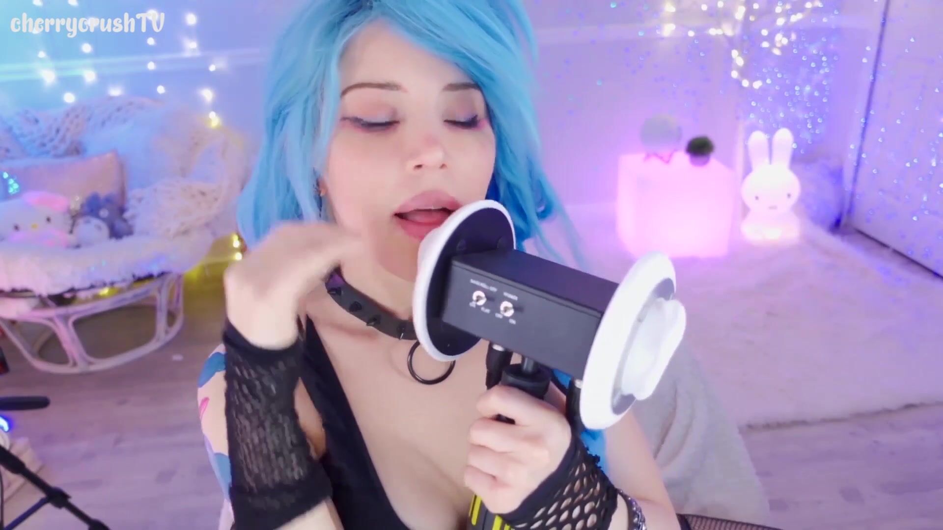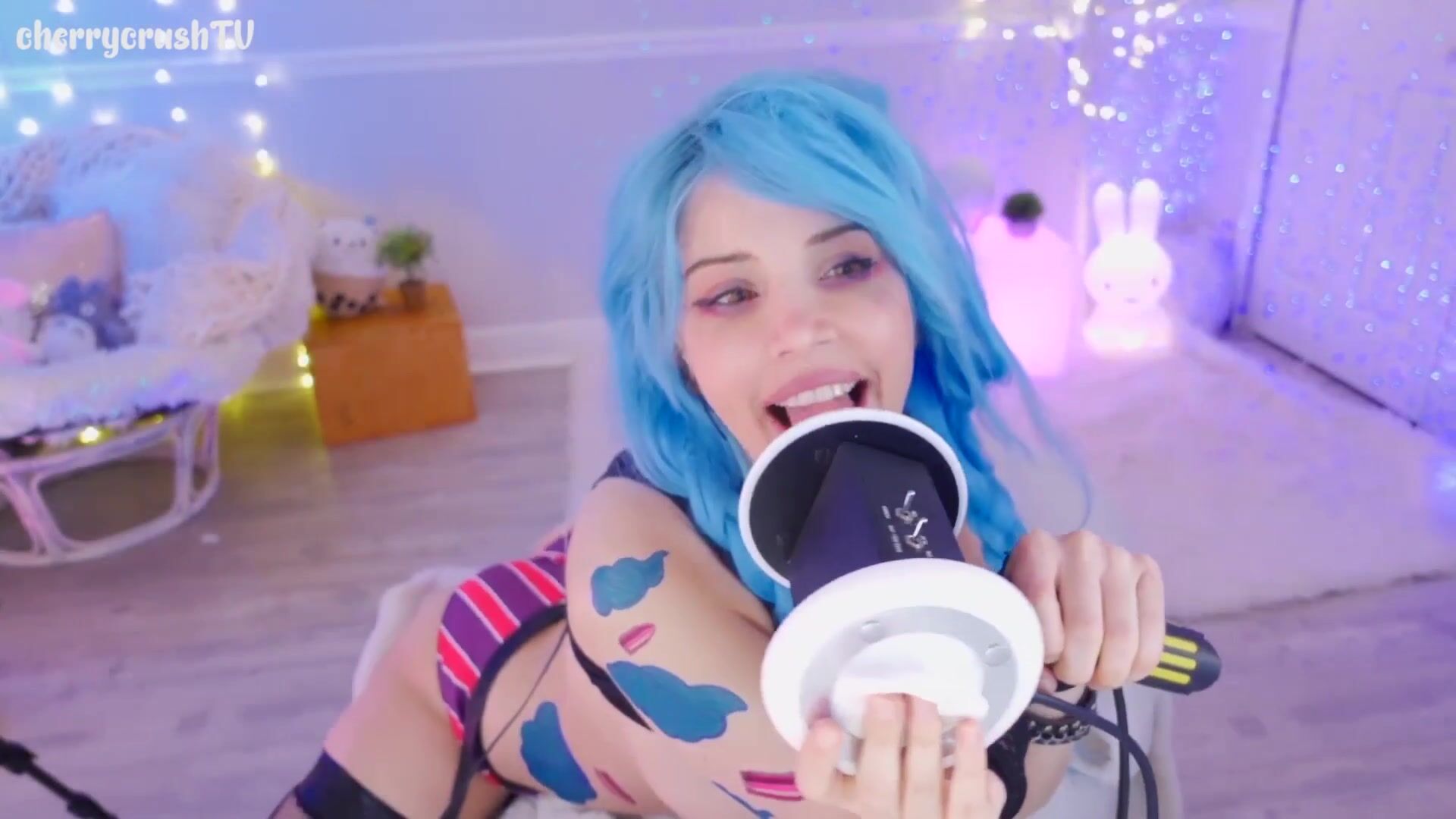 Hot blue-haired cherrycrushTV play with her mic in sexy lingerie in this ASMR video
